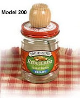A loyal reader turned me on to one of this week's gadgets, Grandpa Witmer's Old-Fashioned Peanut Butter Mixer. You replace your peanut butter jar lid with this thingamabob, which has an arm inside to stir up your natural peanut butter. You then pull up on the handle, which is cleaned by a gasket inside, and remove the lid to scoop out the peanuty paste. Well, OK, that's kind of cool, yes? It's made by Witmer Products of Orrville, Ohio. Now, as it turns out, Orrville is also the home of Smucker's. And this stirrer is designed to fit all the standard Smucker's jars, as well as other brands such as Laura Scudder and Adams.